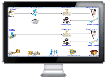 (Cheque Receive) และด้านจ่าย (Cheque Payable) รวมถึงการบริหารจัดการข้อมูลต่างๆ เกี่ยวกับธนาคาร ซึ่งครอบคลุมระบบตั้งแต่